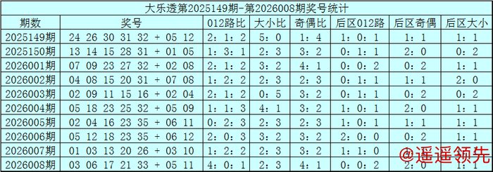 体彩大乐透第26008期奖号为:03 06 17 21 33+05 11,前区奖号012路比为4:0:1,奇偶比为4:1,大小比为2:3,后区为全2路号码。