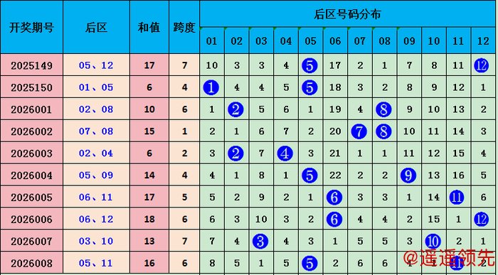 上期后区开出号码05 11,和值16,近十期和值17 6 10 15 6 14 17 18 13 16,和值波动范围较大,本期预测和值会下降,重点关注号码:04 07,和值11。