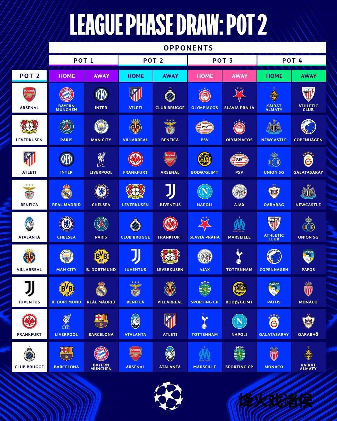 第二档球队包括:阿森纳、勒沃库森、马竞、亚特兰大、本菲卡、布鲁日、法兰克福、尤文、比利亚雷亚尔